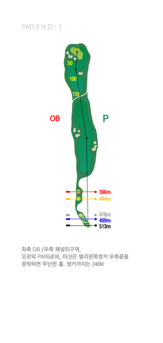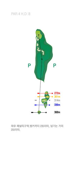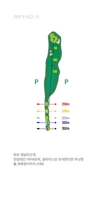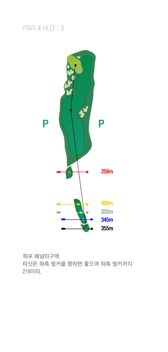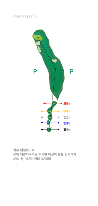 파4. 우측벙커 넘기는 거리는 캐리 240미터. 좌측벙커밭 중앙 또는 우측으로 티샷.세컨샷 지점에서 그린까지는 계속 오르막.