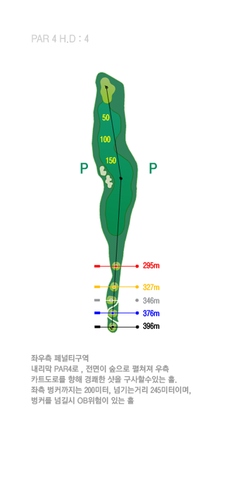 내리막 파4. 좌측벙커 우측 끝방향으로 티샷.세컨샷 지점이후로 계속 내리막.