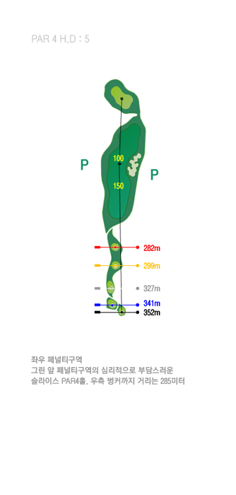 우도그렉 짧은 파5. 안개등 방향은 안전한 공략. 투온공략 예정일 경우 우측 숲 좌측 경계로 공략. 숲을 넘기는 공략은 위험함.세컨샷 지점에서 그린방향. 공격적으로 공략할 경우 이 위치에서 남은거리 190~210미터 수준.드롭존에서도 남은거리 165미터로 쓰리온이 가능하게 해 놨음;;그린 앞에 이렇게 연못이 들어오는 공간이 있어서 투온시도 시에는 정확한 방향성 또는 넉넉한 거리로 공략이 필요함.