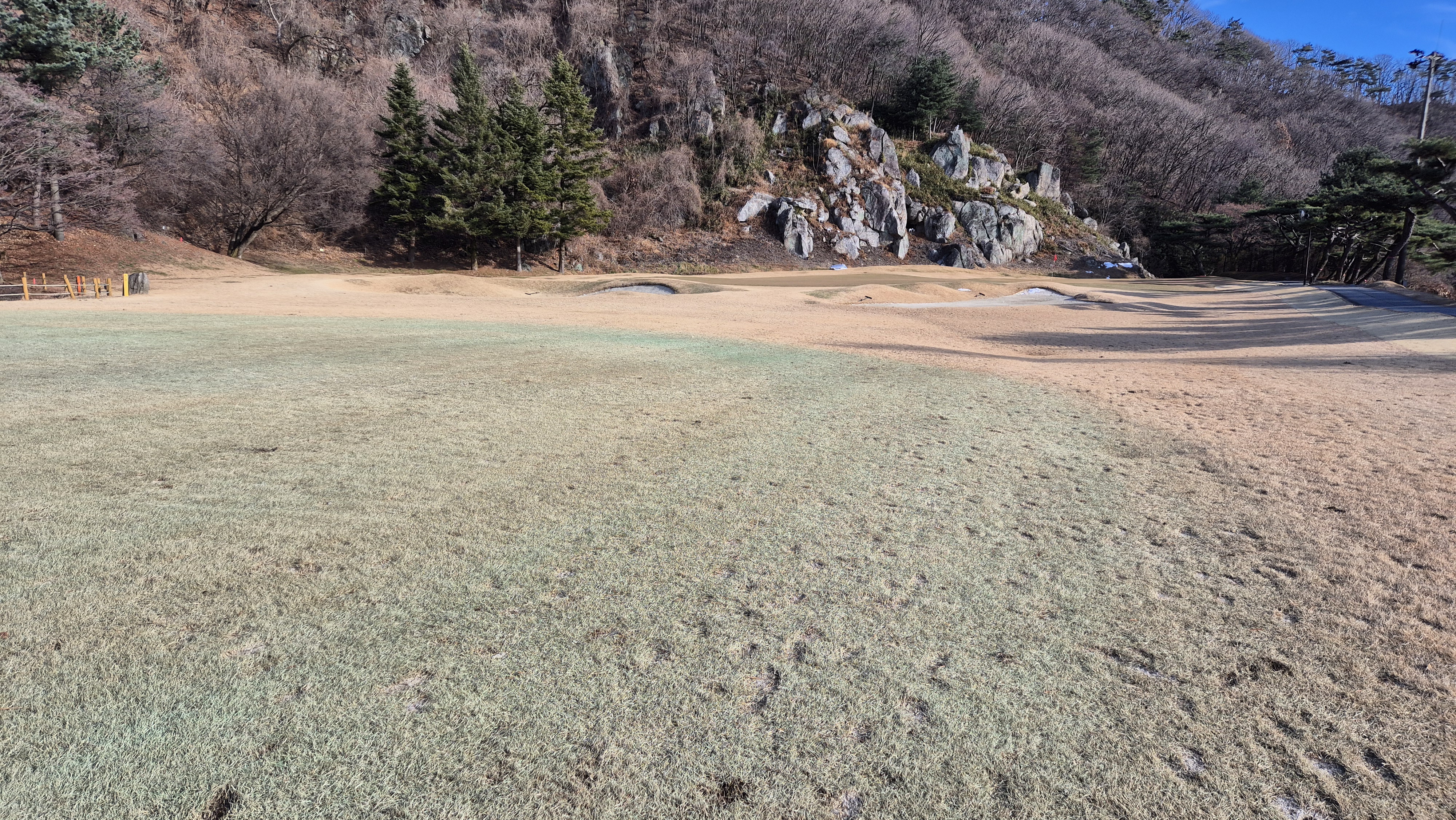 - 페어웨이 잔디 : 페어웨이 잔디는 염색을 해 놓아서 멀리서 보기에는 좋아 보입니다. 디봇이 정말 많았습니다.