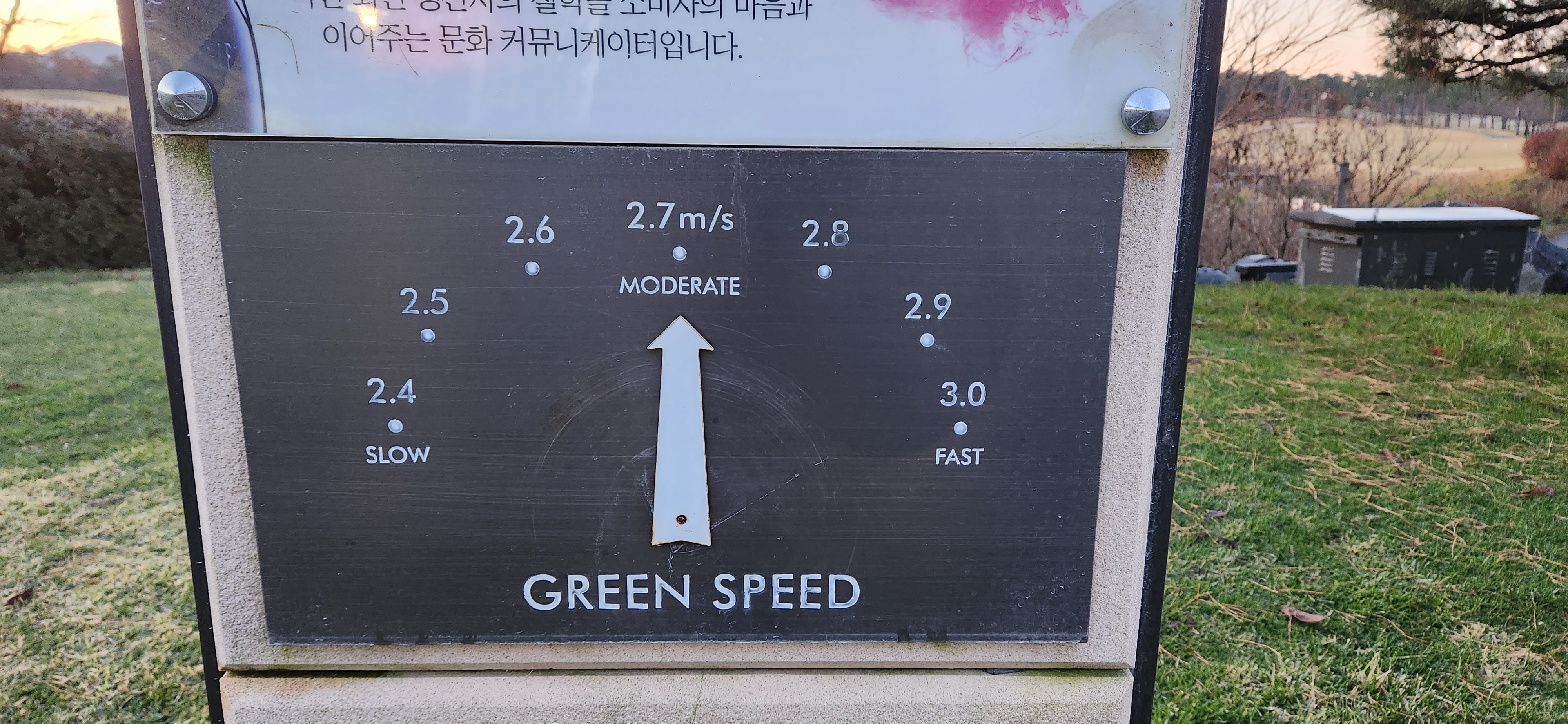 기재된 그린스피드는 2.7이었지만 전반 4~5홀까지는 전날 밤에 내린 비에 그린잔디가 살짝 얼어서 2.3 ~ 2.4 수준이었고, 이후부터는 제 스피드로 그린을 이용할 수 있었습니다.
