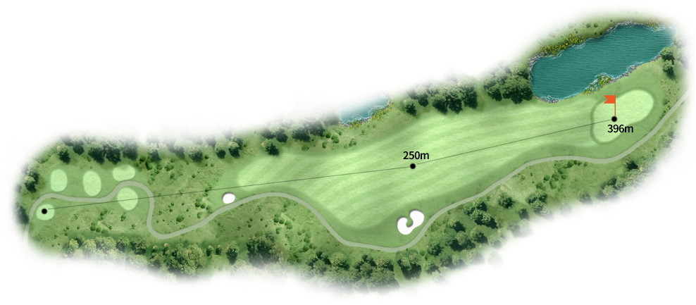직선형 파4. 우측이 좁아지는 홀이라 코스 좌측을 에이밍 하는게 좋음.