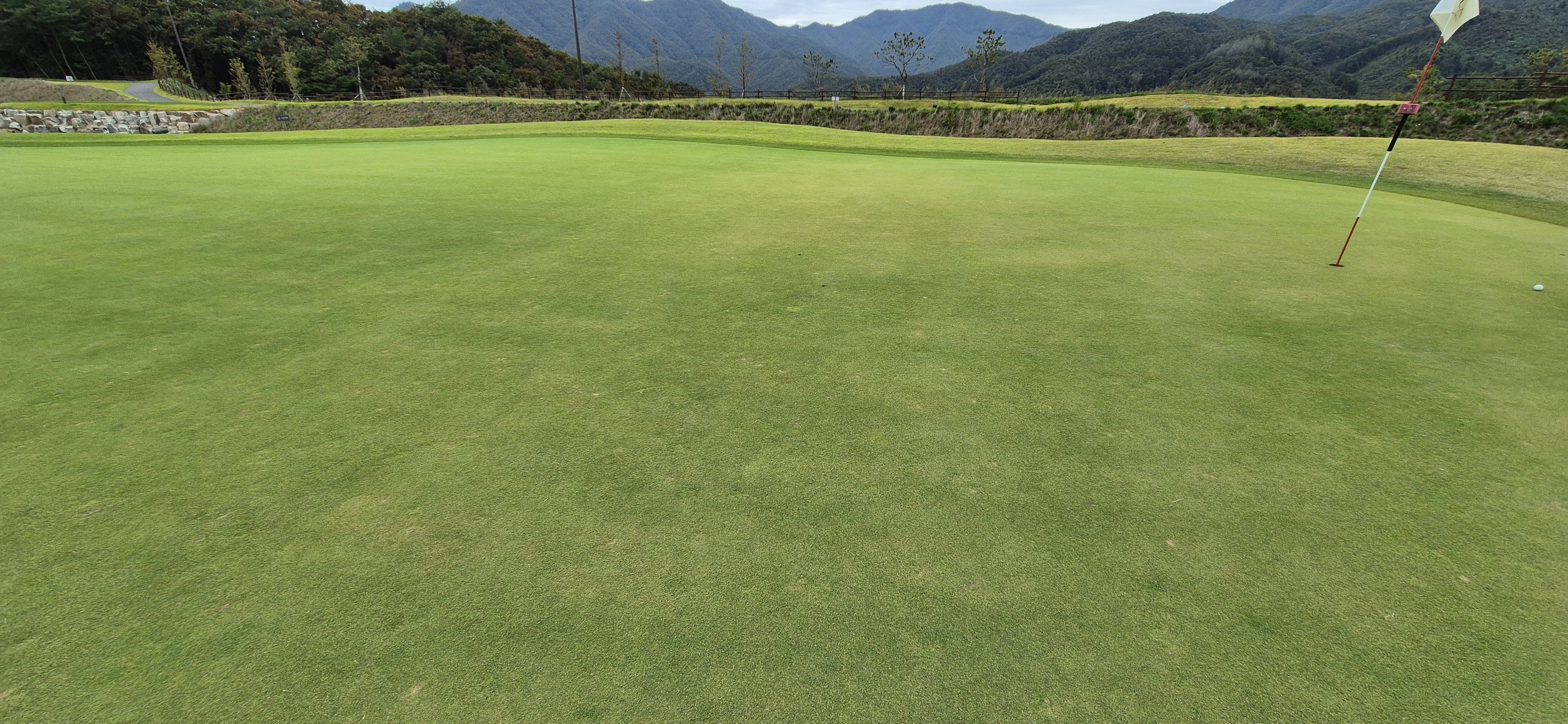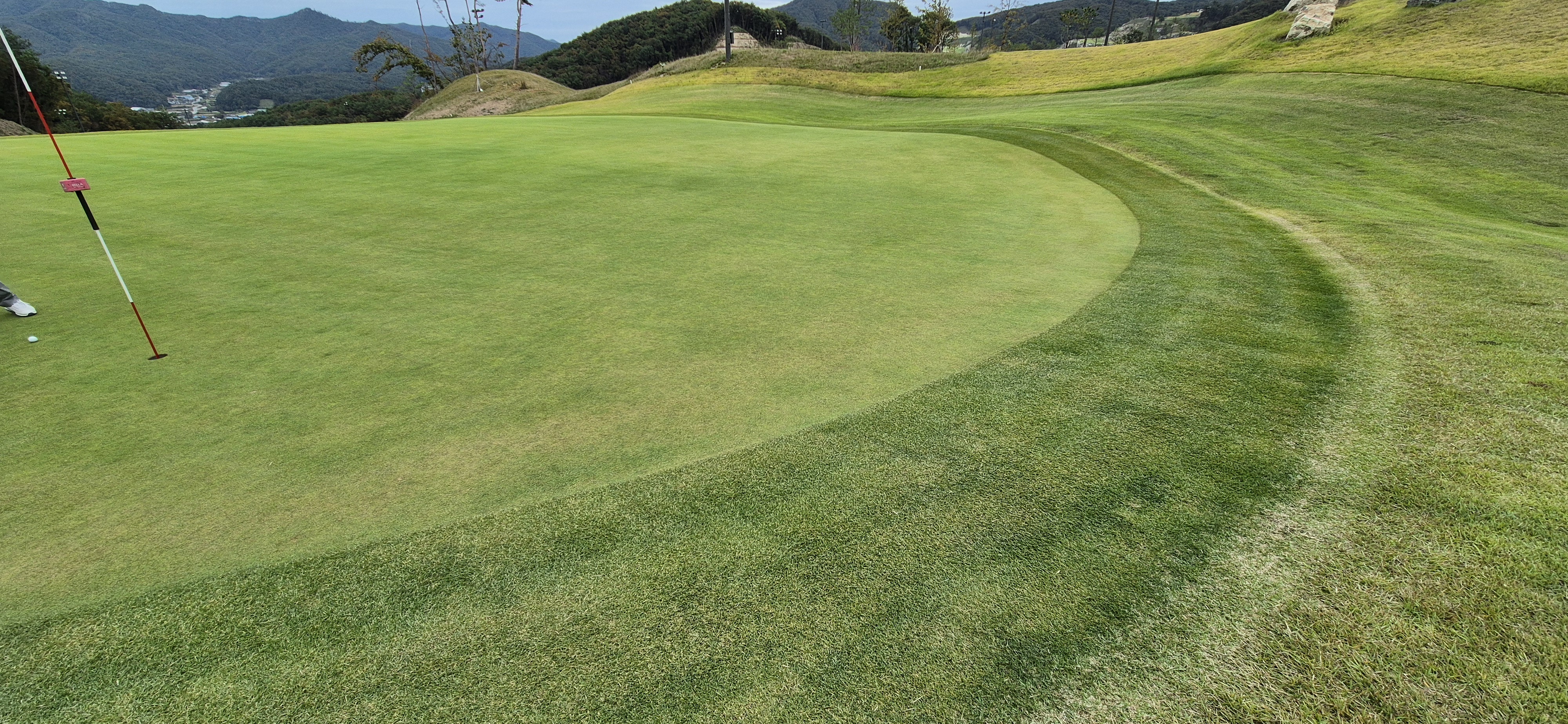느리다는 후기를 많이 본 것 같은데 그린스피드는 2.7~8m 수준으로 괜찮았습니다. 단차로 구분 지어진 그린은 없고, 그린 일부분에 마운드 형태로 살짝 난이도를 준 몇몇 홀을 제외하면 크게 어려운 난이도는 아닐 것 같습니다. 다만, 뒷 핀이 내리막 경사지에 위치한 홀들은 좀 조심할 필요가 있겠네요.