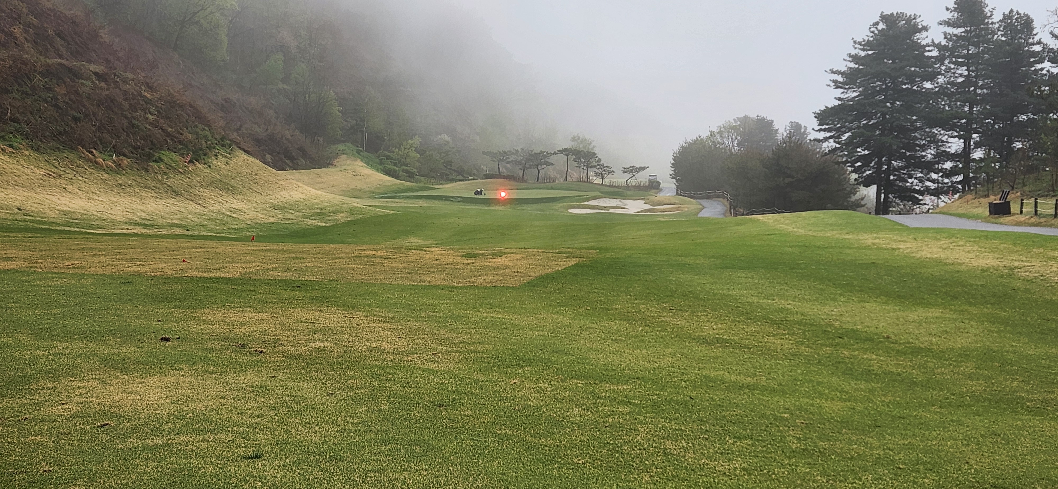 잘 관리된 그린덕에 비가 살짝 내리는 컨디션에도 빠르기는 2.7~2.8m 수준을 유지했습니다. 다만, 홀별로 그린 빠르기에 차이는 있으니 유의하셔야 할 것 같네요. 위 사진에서 보는 것 처럼 그린 사이드 방향에 위 아래로 물결치는 형태의 그린이고 핀 위치가 그 인근 경사지에 꽃혀있어서 3펏 잘 나올 수 있습니다.