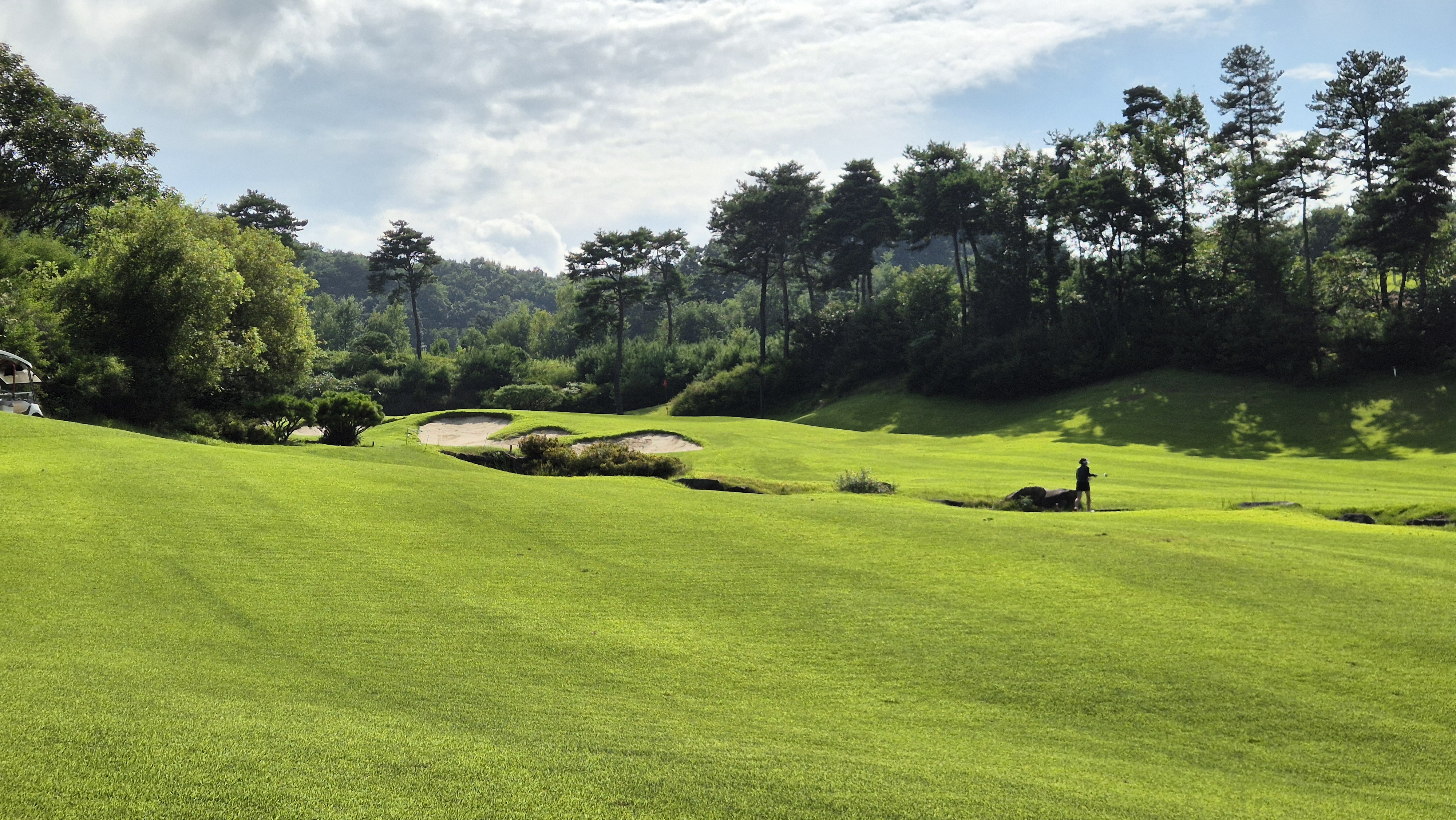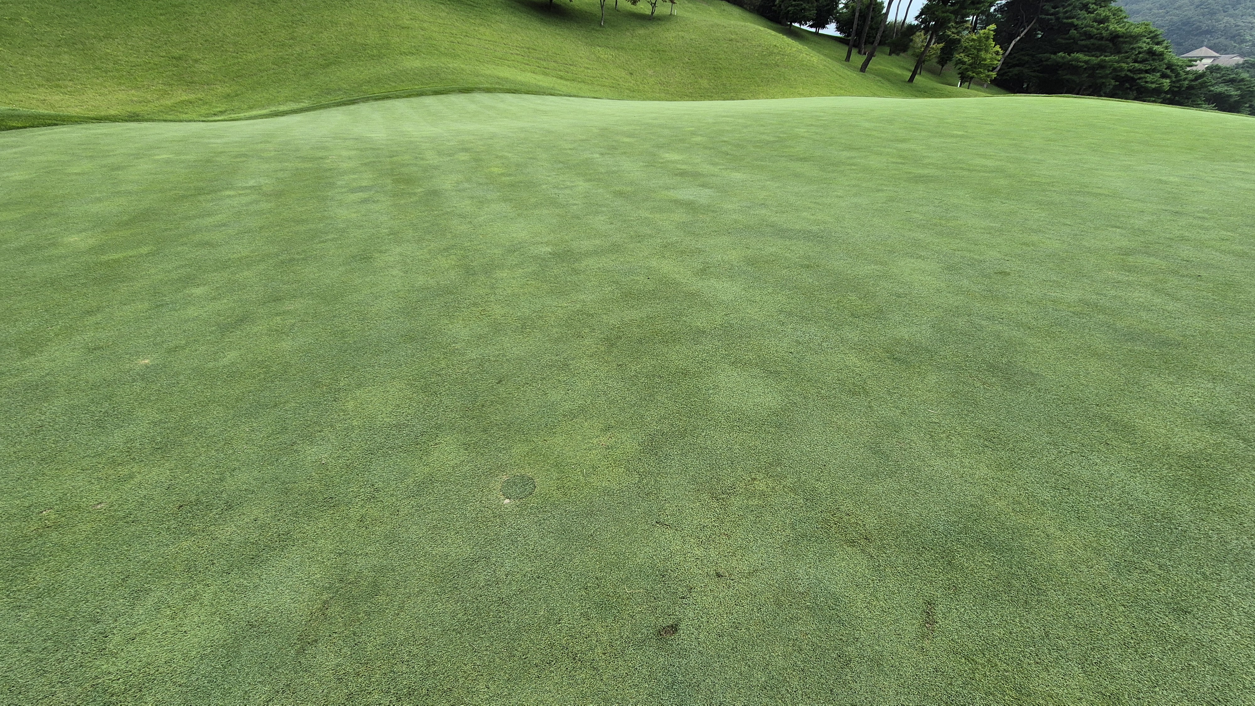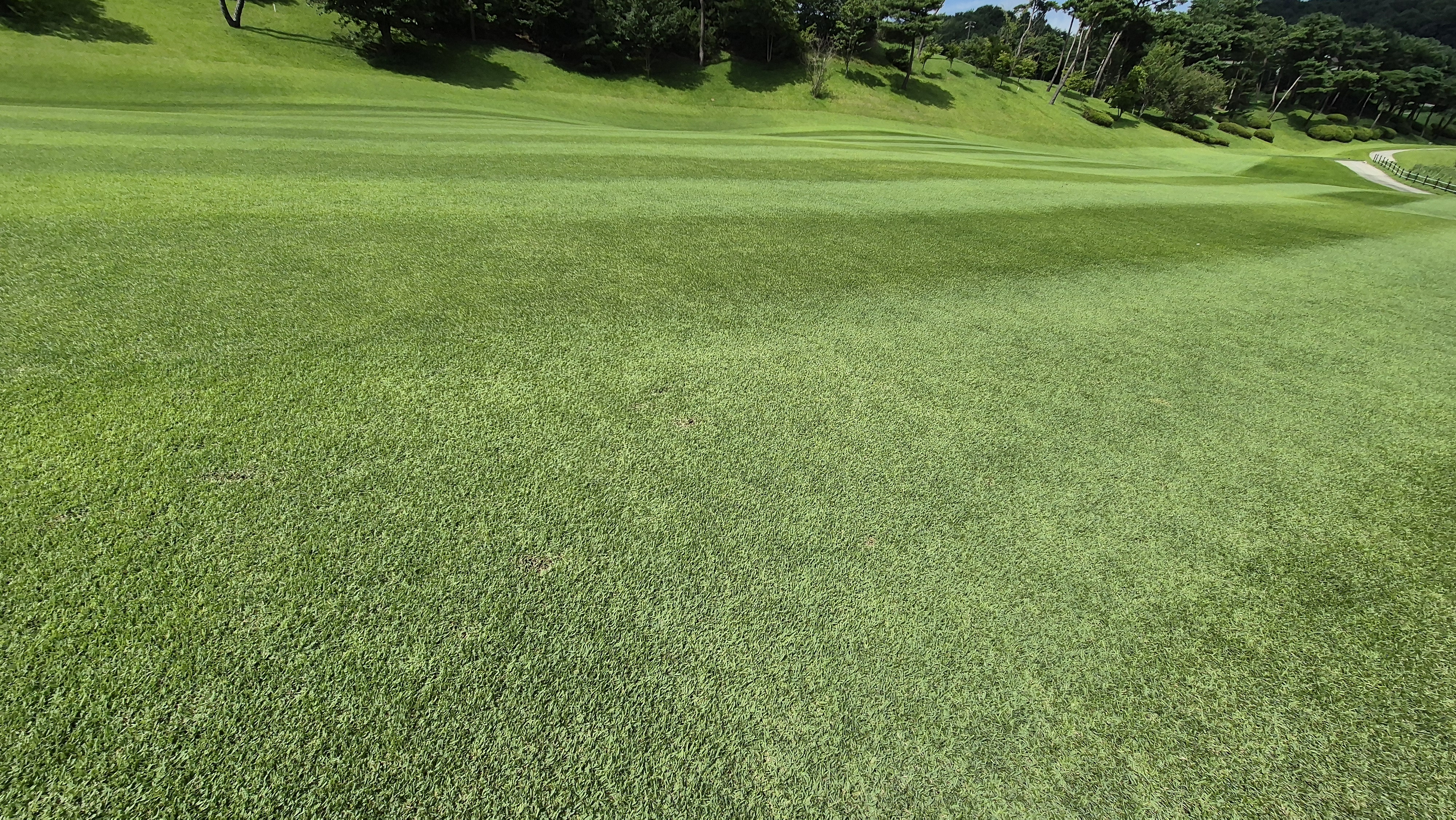 최근 방문했던 괜찮은 골프장들도 여름땡볕 잔디보호 때문에 대부분 2.4m 이하의 느린 빠르기였는데 그린 관리만큼은 상당히 칭찬할 수 있을 것 같습니다. 원래 그런 건지 최근에 내린 비로 인해서인지는 모르겠지만 그린은 살짝 무른 편이었지만 키퍼분들이 계속 관리 중이어서 피치마크가 많이 눈에 띄지는 않았습니다. 웨지샷은 대부분 랜딩 후 2미터 이내에 멈춘 것 같네요.