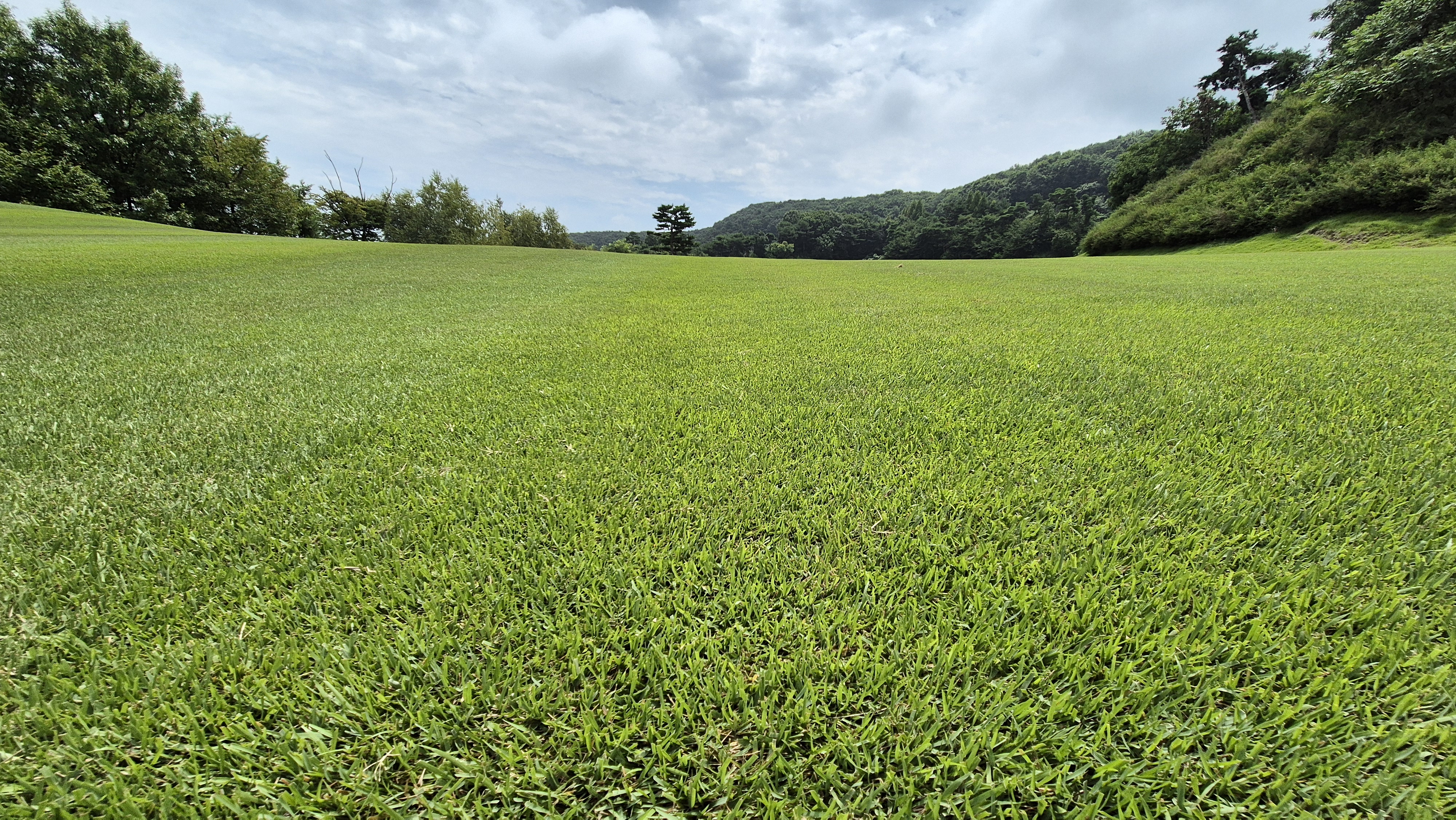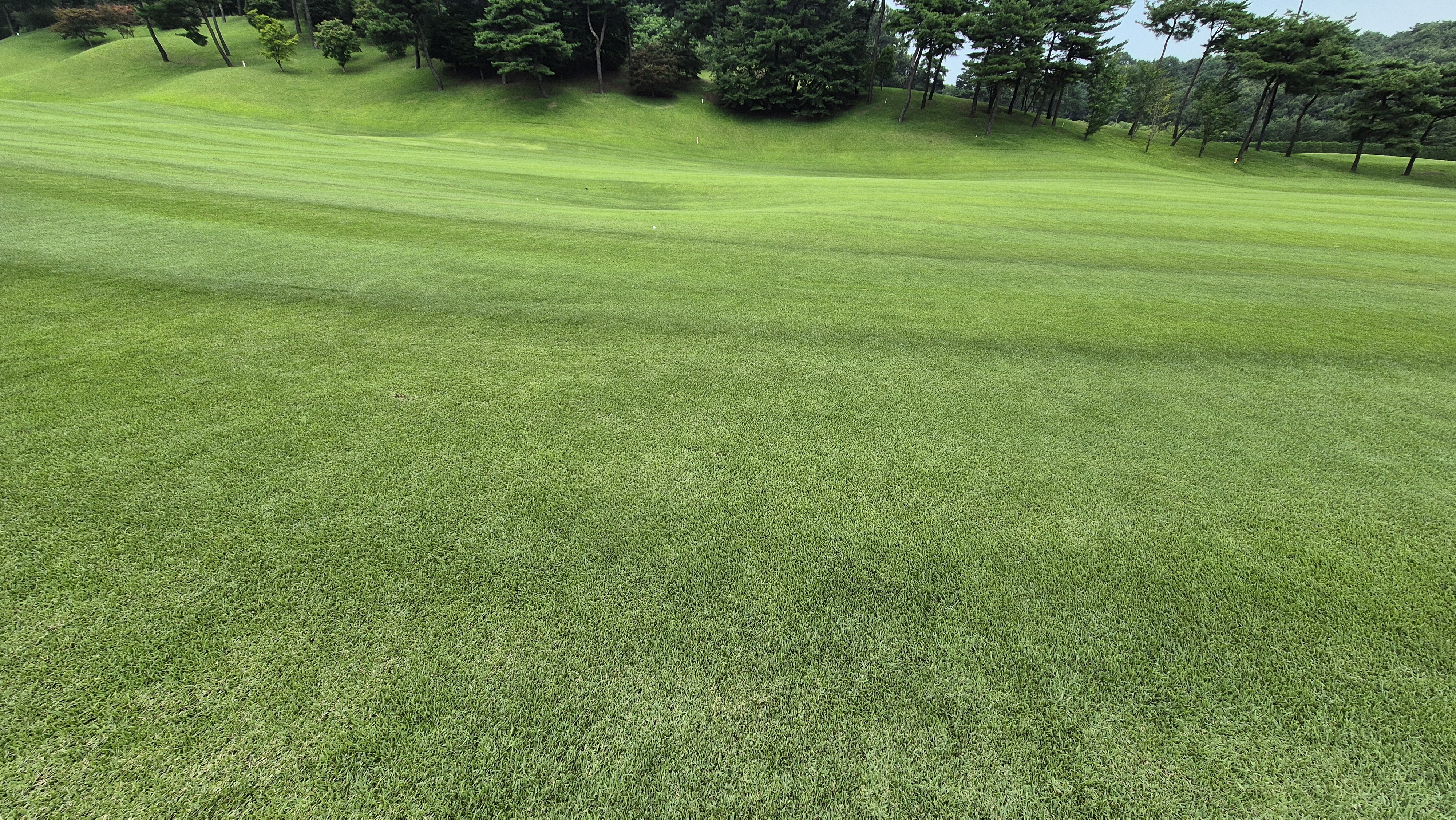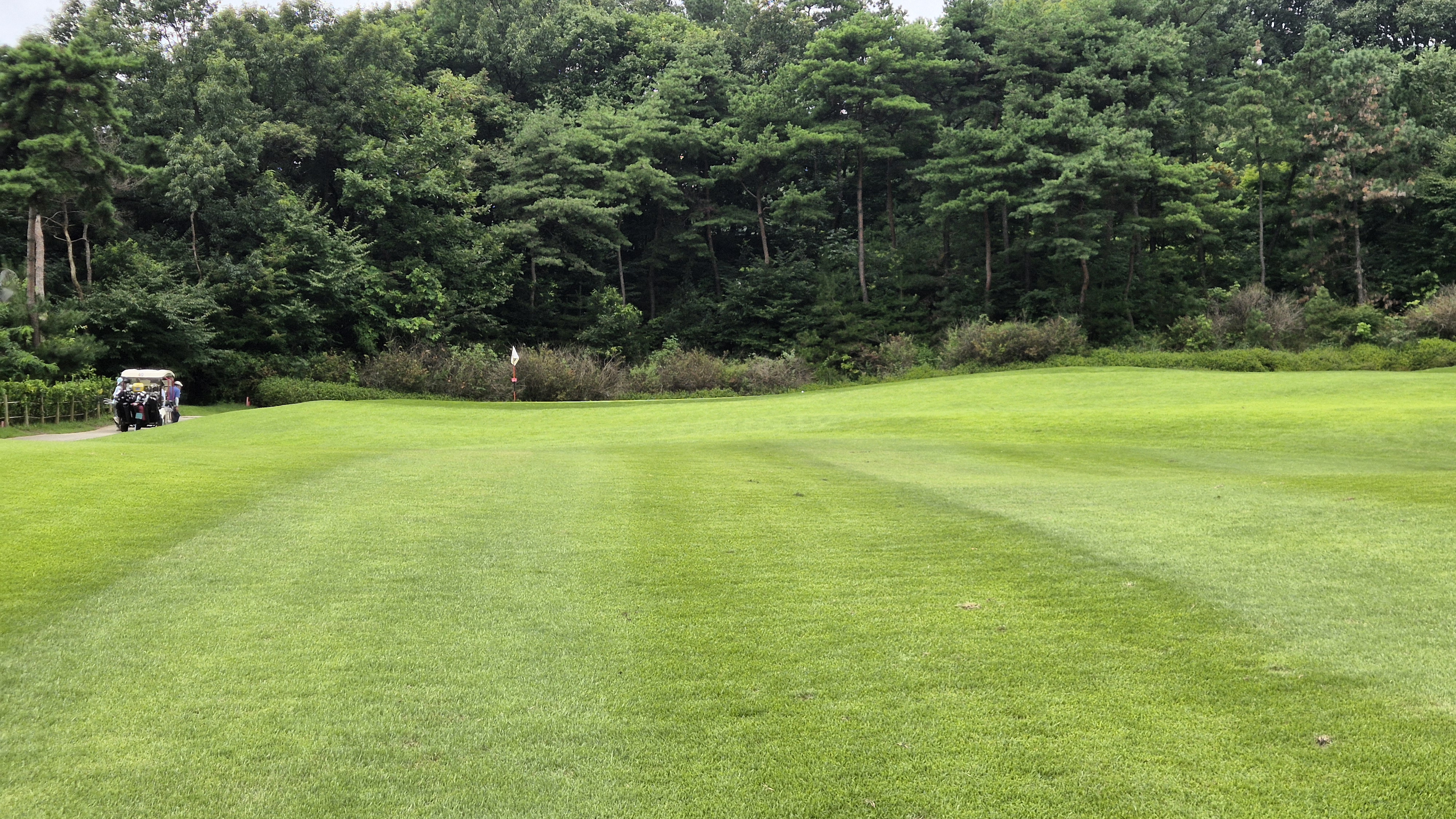 코스 잔디상태는 상당히 좋았습니다. 탈락된 구역도 거의 없었고 빽빽한 수준의 쿠션감도 괜찮은 수준. 페어웨이와 러프잔디의 구분은 없는 편이어서 페어웨이 놓쳐도 부담이 전혀 없는 수준이네요.