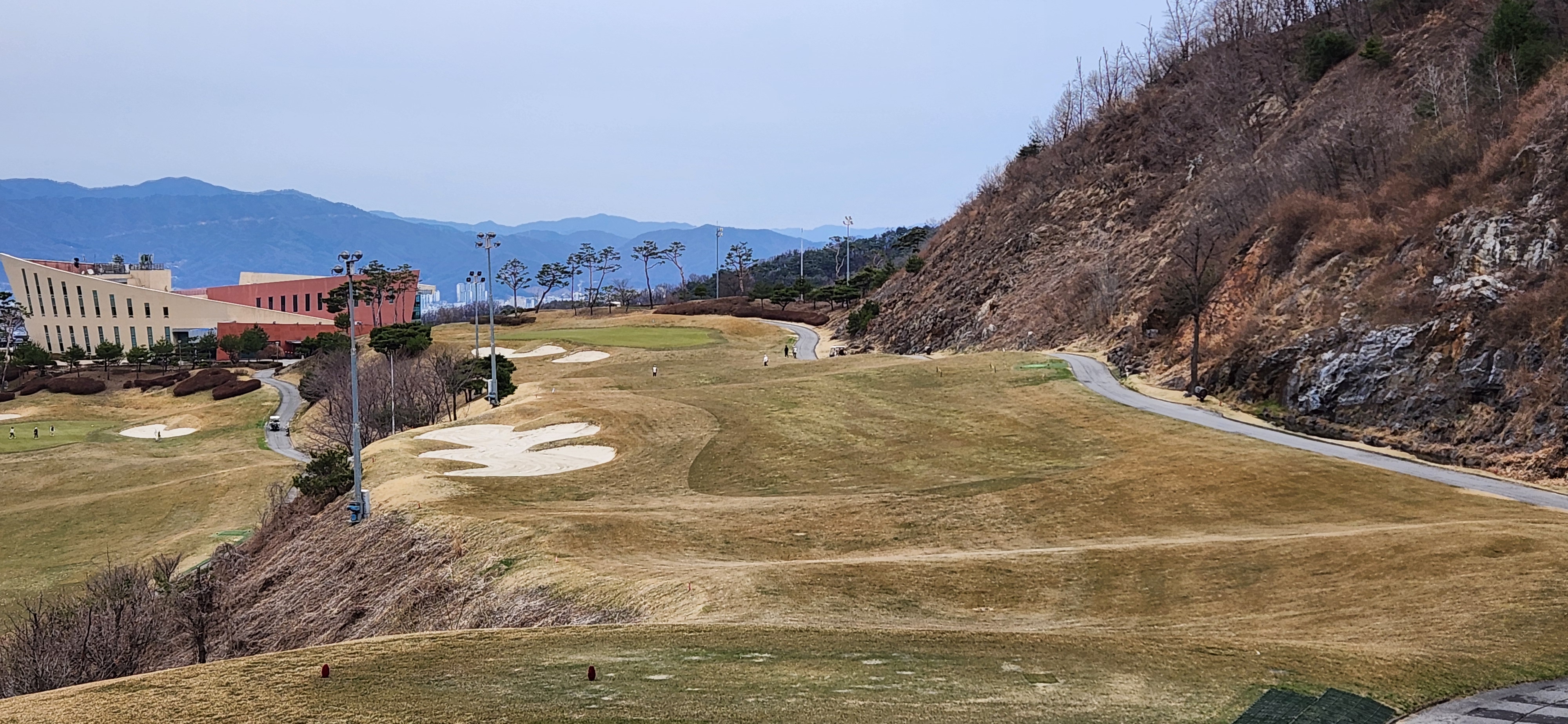 산을 깎아서 '다랑이 논'처럼 조성한 골프장으로 중간 그늘집에서 이런 풍경을 감상할 수 있습니다.